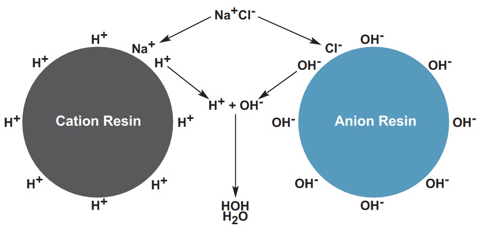 Về nguyên lý, hệ thống lọc nước DI hoạt động dự trên các nguyên tắc trao đổi ion nhằm loại bỏ ion- và ion+ bằng các hạt ion tương thích.