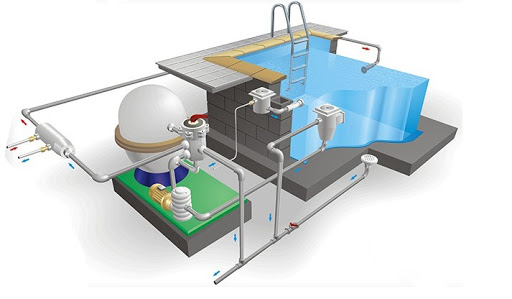 Hệ thống lọc được hoạt động theo bơm tạo áp chuyên dụng hồ bơi (P2), hút nước từ nắp thu đáy đẩy qua cột xử lý chuyên dụng hồ bơi (F1), áp dụng công nghệ lọc áp lực bằng sỏi đỡ và cát thạch anh để lọc tạp chất bẩn trong bể.